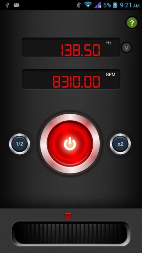 आप उपकरण (जैसे. एक कताई शाफ्ट, हिल छड़ी) की एक घूर्णन या oscillating टुकड़ा मान लीजिए, और आप यह बढ़ रहा है कितनी तेजी से जानना चाहते हैं, इस app आप मदद कर सकते हैं. कंपन या रोटेशन के रूप में एक ही गति से कौंध कि स्ट्रोब प्रकाश, मद के लिए प्रदर्शित होगा स्ट्रोब प्रकाश के तहत 'फ्रीज'. आप चमकती रोशनी की आवृत्ति पता है, तो आप कंपन की आवृत्ति या शाफ्ट की गति बता सकते हैं.