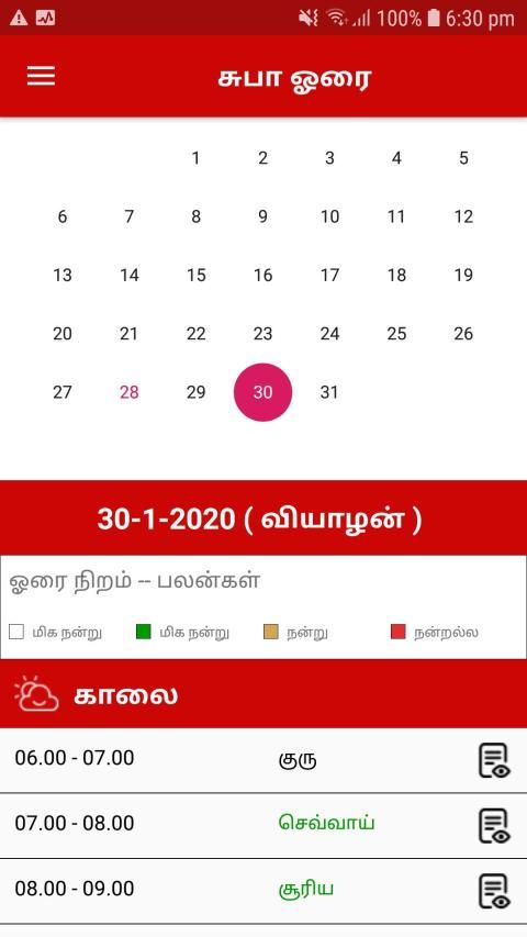 सुभा होरई तमिल ऐप उपयोगकर्ताओं को पूरे दिन, सप्ताह और महीने के लिए होराई समय की जांच करने की सुविधा देता है। साथ ही प्रत्येक होराई की जानकारी भी विस्तार से प्रदान करता है।