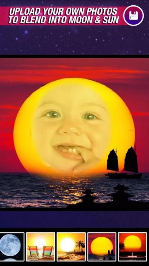 Sun Moon Faces is the best way to make you kids photos look special with your kids photos embedded in nature photos of sun and moon. Make Normal photos into Devine Photos with Sun Moon Faces.