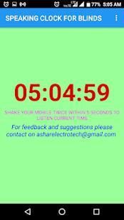 इस एप्लिकेशन को समय नेत्रहीनों व्यक्तियों के लिए विशेष रूप से आसान जानने और के साथ-साथ आम लोगों के लिए बनाने के लिए करना है। : mm: ss स्वरूप एप्लिकेशन स्क्रीन hh में एक हरे रंग की पृष्ठभूमि के साथ वर्तमान समय दिखाता है। 5 सेकंड के लिए दूसरे शेक के लिए पीले और एप्लिकेशन प्रतीक्षा करता है स्क्रीन को एक बार रंग में परिवर्तन के उपकरण को हिलाकर पर। डिवाइस 5 सेकंड के भीतर दो बार shaked है, तो स्क्रीन नीला हो जाता है और वर्तमान समय बोली जाती है। दो बार सुविधा हिलती गलत trigging समय बोलने के लिए रोकने के लिए प्रदान की जाती है।