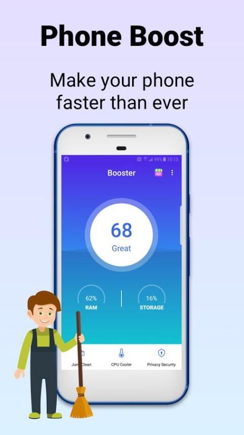 बस एक टैप से किसी भी समय अपने फोन को बढ़ाएं। अपने फोन के प्रदर्शन बेहतर करना कभी भी आसान नहीं रहा है! सीपीयू के गर्म हो के कारण आवेदनों बंद करो और फोन कूलर हैं।