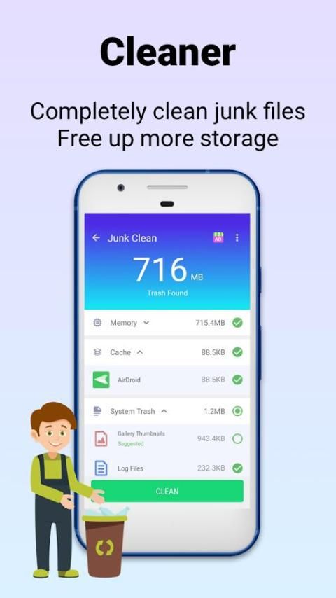 समझदारी से स्कैन और, सिस्टम और ऐप्स कैश, बेकार अनुप्रयोग, अवशिष्ट फ़ाइलें आदि स्वच्छ जंक फ़ाइलों सहित जंक फ़ाइलों को हटा दें संग्रहण स्थान खाली और एक टैप में फोन की गति को बढ़ावा देने के!