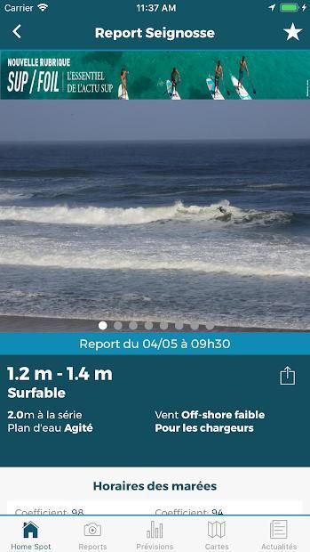 Une page d'accueil personnalisable : Choisissez vos spots favoris pour découvrir en un coup d'œil les prévisions et les reports du jour.