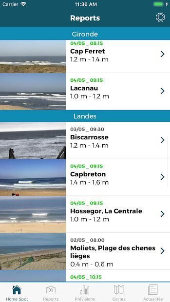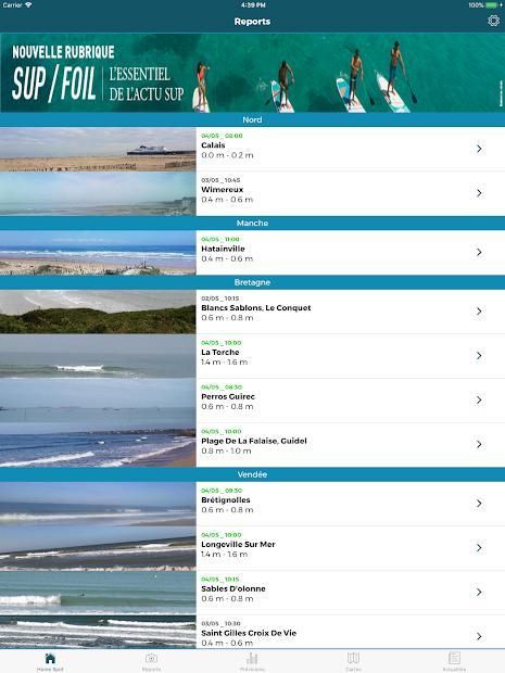 Plus de 30 reports quotidiens : Dans toutes les régions de France, mais aussi au Maroc et dans les DOM-TOM nos reporters vous offrent la possibilité de surveiller les conditions en photo ou vidéo avec un conseil personnalisé. Débutant ou confirmé, le reporter précise également à quel niveau correspondent les vagues du jour.