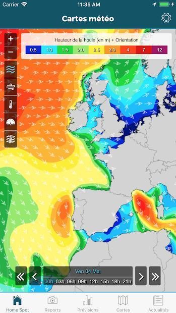 Des prévisions météo à 7 jours : Pour cette nouvelle version nous avons entièrement revu notre modèle de prévisions. En France comme aux Caraïbes, surveillez les prévisions sur votre spot et découvrez la note de la session, de 0 étoile s'il vaut mieux rester chez soi à 3 étoiles pour une session parfaite. Un indicateur qui vous permettra de savoir en un instant s'il y a du surf aujourd'hui.