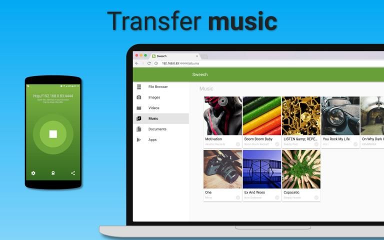 Sweech आप किसी भी कंप्यूटर, टैबलेट या स्मार्टफोन के साथ आसानी से फ़ाइलों का आदान प्रदान करने की अनुमति देता है।