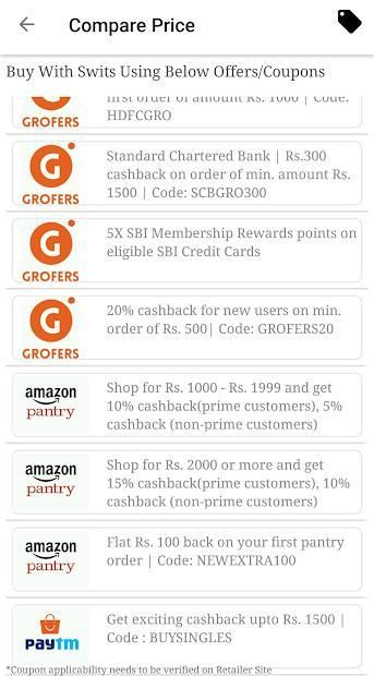 Swits, आपके ऑनलाइन किराने की दुकान सभी प्रमुख बाजार खुदरा विक्रेताओं के पार की तुलना करके अपने किराने का सामान सस्ता मूल्य पर आपके दरवाजे पर वितरित हो जाता है।