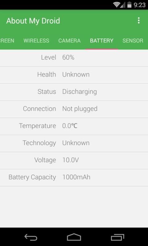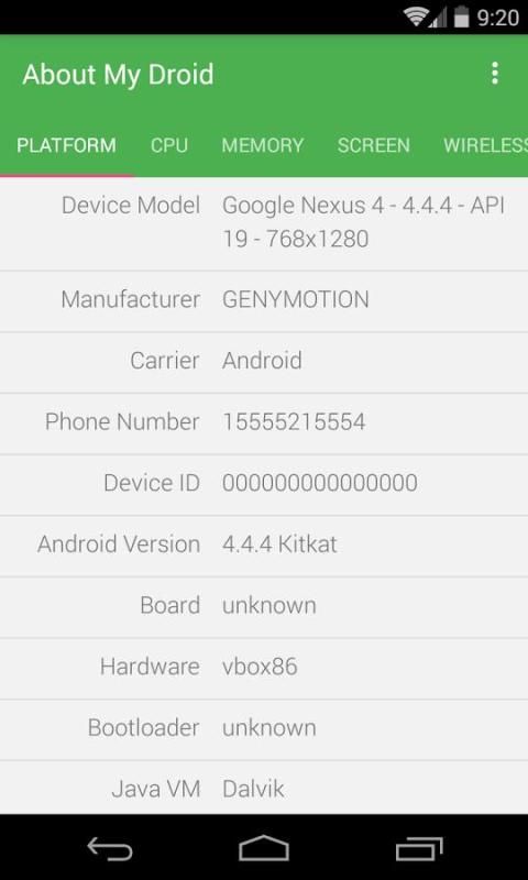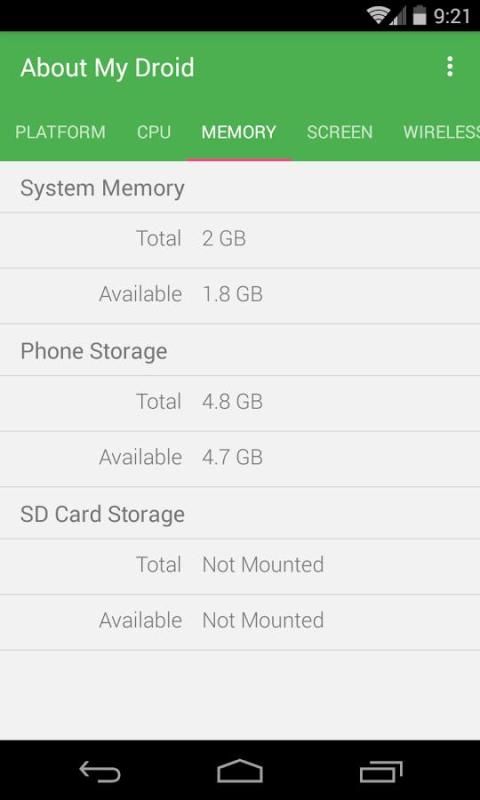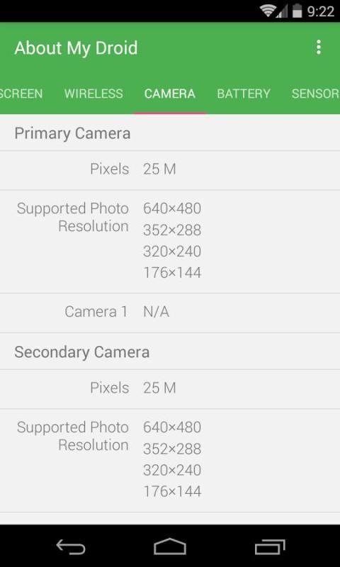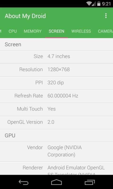 मेरे Droid के बारे में सिस्टम, सीपीयू, स्क्रीन, भंडारण, कैमरा, बैटरी, वायरलेस तकनीक और सेंसर सहित अपने एंड्रॉयड डिवाइस के बारे में सब कुछ प्रस्तुत करता है कि एक बहुत ही हल्के भारित app है।