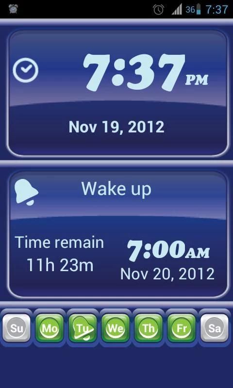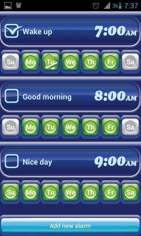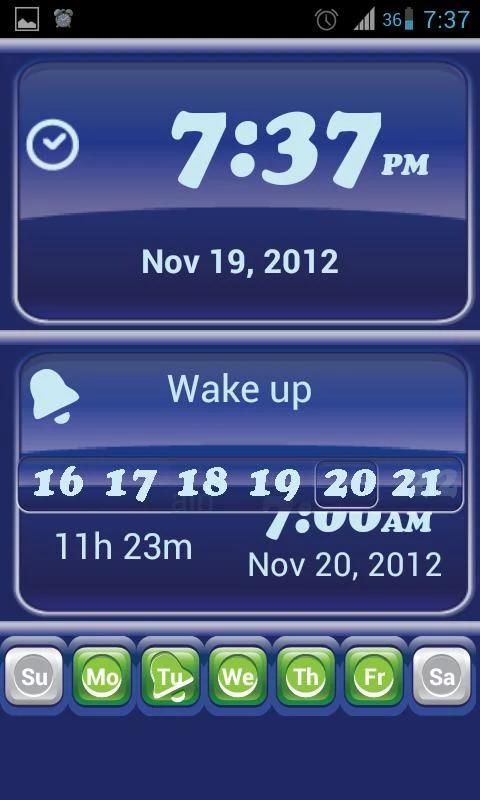 The main feature of the program is that you can change the time of next alarm once. For example, you can skip alarm for tomorrow but the next day you'll be waked up as normal. You also can change once the time of next alarm.