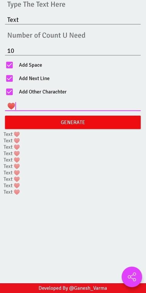 just give the count and you can share the times which you have given as count by clicking the share button the text in the clipboard will be copied and the sharing of other social media are also available For Exam You want to tell sorry to your girlfriend just type once and make the count as 1000 copy it and send it to her she will be impressed and in many ways you can multiply the text and special charters also