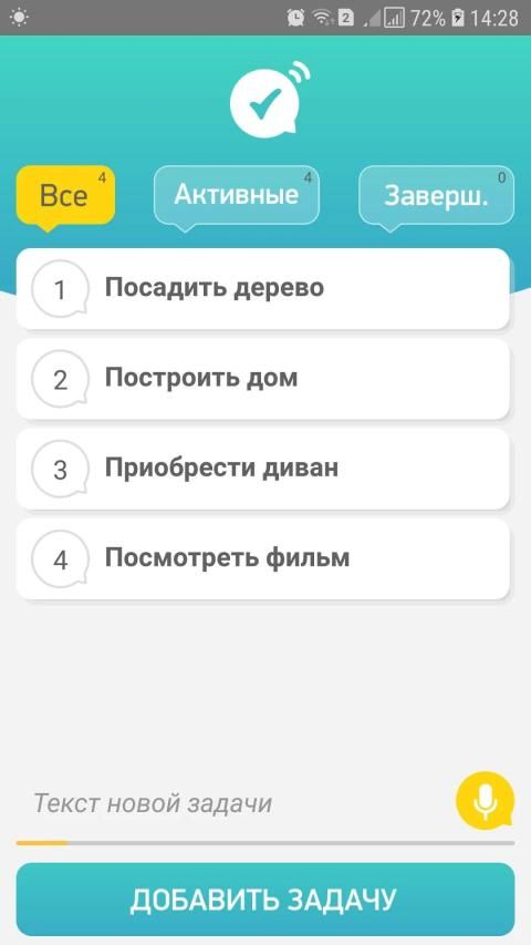 Приложение поможет вам управлять задачами, которые необходимо выполнить в течении дня или в ближайшем будущем. С помощью данного TO-DO менеджера вы можете совершать следующие действия: добавлять задачи (в том числе с помощью голосового ввода), перемещать их по списку (drag & drop), переименовывать, удалять, помечать как выполненные, устанавливать фильтры. Любые ваши замечания или предложения приветствуются.