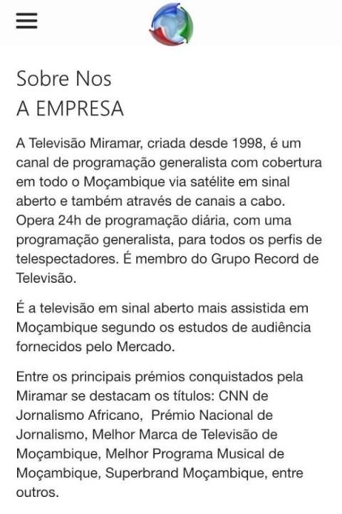 टेलीविजन मीरामार, 1998 के बाद से स्थापित है, एक सामान्य प्रोग्रामिंग कवरेज के साथ मोजाम्बिक उपग्रह खुला संकेत भर में और भी केबल चैनलों के माध्यम से चैनल है। 24 दैनिक कार्यक्रम संचालित होता है, सभी दर्शकों के प्रोफाइल के लिए एक सामान्य अनुसूची के साथ। रिकार्ड समूह टीवी के एक सदस्य है।