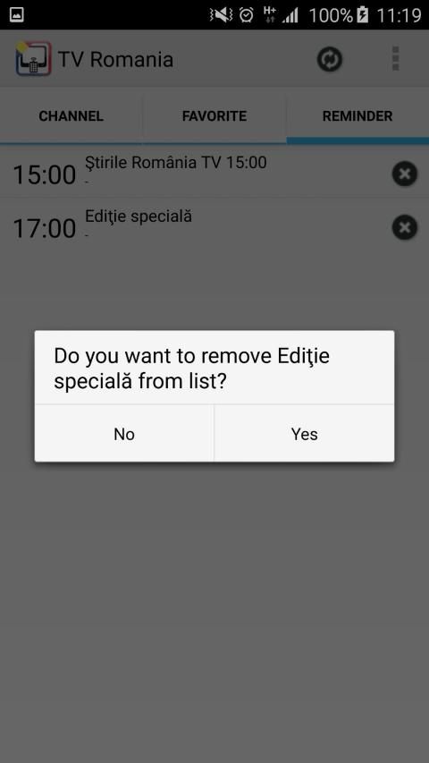 Romanian tv channels guide. Tv Romania include lots of Romanian tv channel daily guide. You can see daily guide of each channel, now and next program list of all channels. You can define favorite list by selecting channels. Also you can set up reminder for programs. Reminder work as notification before 5 minutes to program start. This application is not a tv broadcasting application, it only contains Romanian tv channels daily guide. So you can not watch tv by this application.
