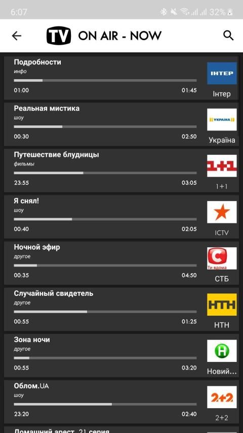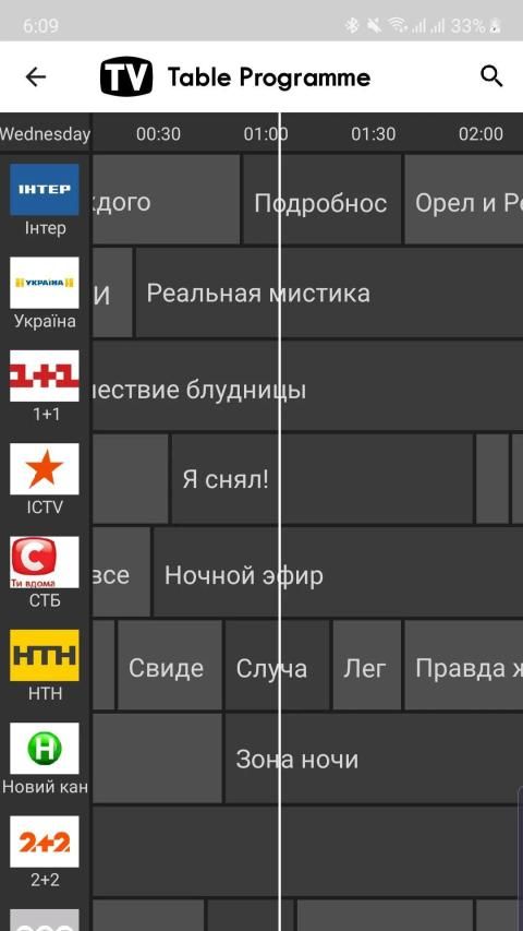 INTER, 1 + 1, ICTV, NTN, यूक्रेन टीवी, K1, STB, मेगा और XSPORT सहित यूक्रेन में प्रसारित सभी टीवी चैनलों की गाइड लिस्टिंग