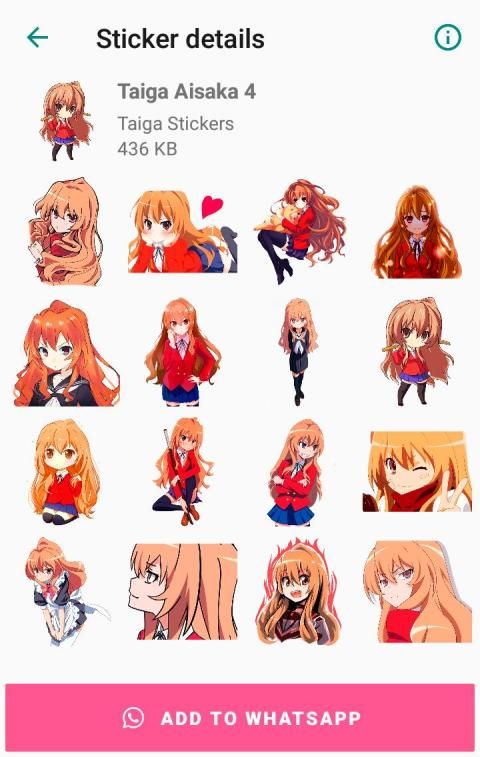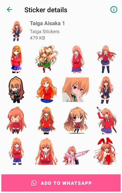 This app contains a collection packs of Taiga Aisaka Stickers for WhatsApp. Cute Kawaii Taiga Aisaka for WhatsApp stickers collection, with many different stickers set. Now express yourself using awesome Toradora Aisaka Stickers with WAStickerApps.