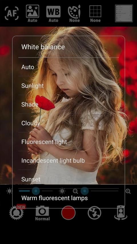 -White balance settings (incandescent, fluorescent, auto, daylight, cloudy)