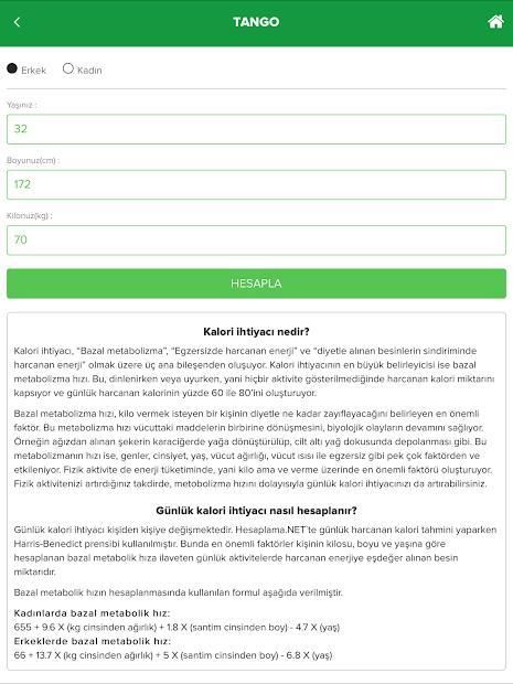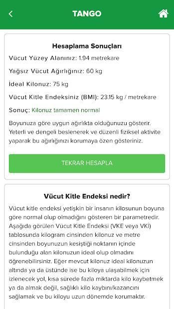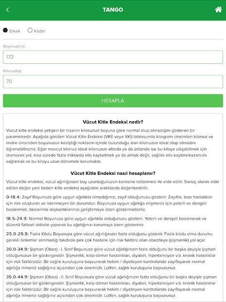 Tango uygulamasıyla vücut kitle endeksinizi hesaplayabilir. Fazla kilolarınızı kontrol edebilirsiniz. Ayrıca Tango uygulaması size günlük su ihtiyacınızı ve ortalama günlük kalori ihtiyacınızı hesaplama imkanı verir.