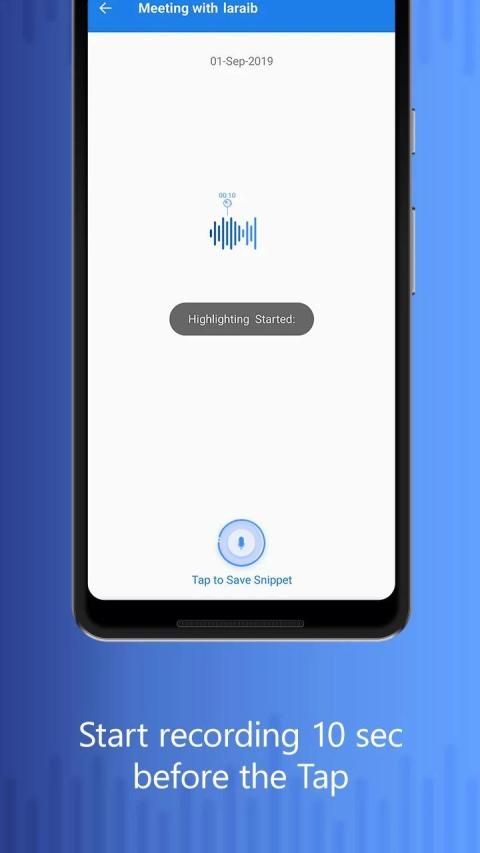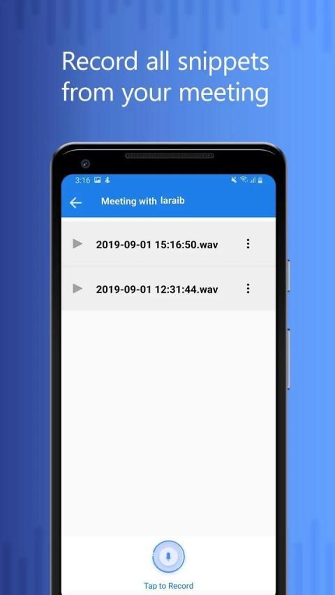 TapTap makes you 10x productive in meetings and lectures. Ditch the note- writing/typing. Engage with the people more. TapTap actively listens to the audio when you create the meeting. You just tap once when you realize something important has been said. TapTap will start recording 10 sec before the tap and keep recording until you feel that the speaker has digressed and you tap to finish. However, it will keep listening so you can create more snippets. When the meeting is finished, you just hold tap long and then access your recordings under your meeting.