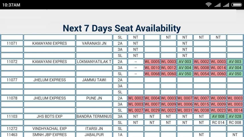 2. Seat availability: Get seat reservation information on all trains of the Indian Railways directly from the IRCTC booking servers. Just enter the source and destination information and you are provided with reservation status on all the classes of travel instantly directly from IRCTC. Probability of getting Confirm Ticket (tkt) is also shown.