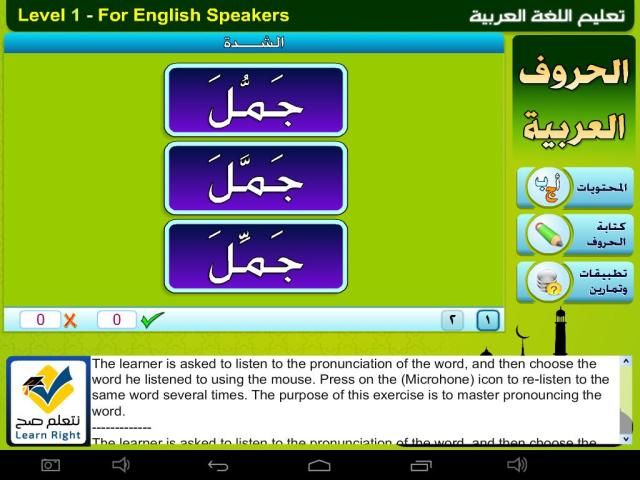 ए। शिक्षार्थी शिक्षण कैसे, अरबी वर्णमाला के बारे में तो शब्द और वाक्य लिखने के लिए विभिन्न स्तरों के साथ अलग अभ्यास के माध्यम से ले जाकर करने के लिए।