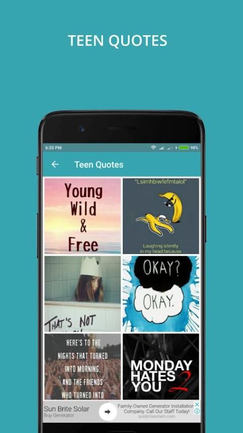 वहाँ कुछ एक किशोर होने के बारे में विशिष्ट शांत है, और इन वॉलपेपर सिर्फ इतना है कि वाइब दे! इस एप्लिकेशन को सुविधा बातें है कि पूरी तरह से विचार और किशोर जीवन की भावनाओं पर कब्जा में प्यारा और मजेदार वॉलपेपर। ईमानदार और वास्तविक भावनाओं को मजाकिया और तेज बातें से, आप हर मूड के लिए एक वॉलपेपर खोजने के लिए सुनिश्चित हो जाएगा! इन पृष्ठभूमि पर वाक्यांशों, उदासीनता और मोहभंग युवाओं की नकारात्मकता पर कब्जा करते हुए भी मजेदार बातें की लापरवाह पक्ष भी दिखा रहा है,।