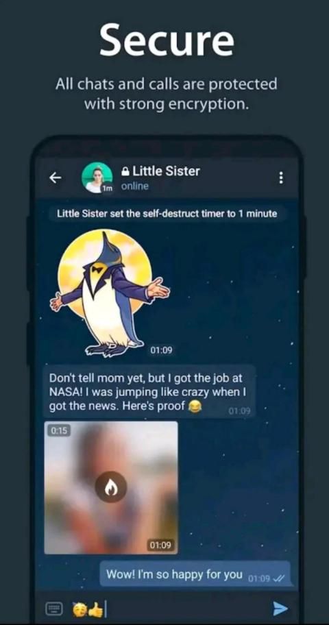 अधिकतम गोपनीयता में रुचि रखने वालों के लिए, टेलीग्राफ मैसेंजर गुप्त चैट प्रदान करता है। गुप्त चैट संदेशों को दोनों भाग लेने वाले उपकरणों से स्वचालित रूप से आत्म-विनाश के लिए प्रोग्राम किया जा सकता है। इस तरह आप सभी प्रकार की गायब सामग्री - संदेश, फोटो, वीडियो और यहां तक कि फाइल भी भेज सकते हैं। गुप्त चैट यह सुनिश्चित करने के लिए एंड-टू-एंड एन्क्रिप्शन का उपयोग करते हैं कि एक संदेश केवल उसके इच्छित प्राप्तकर्ता द्वारा पढ़ा जा सकता है।