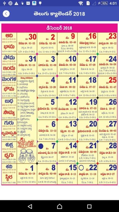 * "तेलुगू कैलेंडर 2018" में हर विस्तार तेलुगु भाषा में लिखा है।