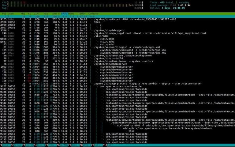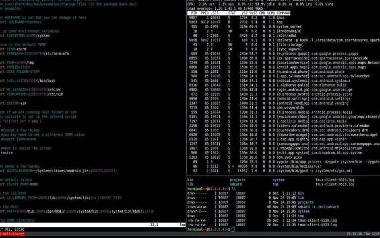 GCC 4.4.0, make 3.82, ctags, javac, java, dx, proguard, aapt, apkbuilder, signer, ssh, sshd, telnetd, bash 4.2, busybox 1.19.2, vim 7.3, nano 2.2.6, midnight commander 4.8, htop 1.0, TMUX 1.5, links 2.7, rsync 3.0.8, git 1.7.8, BitchX 1.1 and a nice terminal emulator are all available.