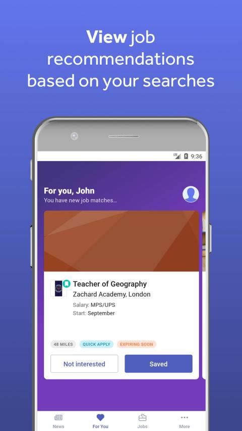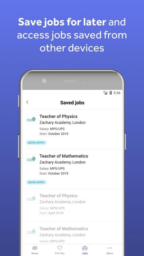 Save jobs: if you’re not ready to apply for a job on your mobile device, you can save it to come back to later, either within the Tes app or on the Tes website.