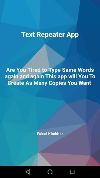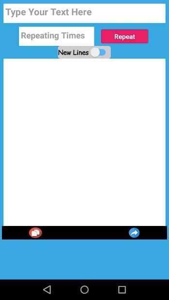 Text Repeater App this application you can send the same message at multiple times. This app is combo pack for the all repetition app with a low size of the APK It is one kind of message repeater to send message repeatedly, and also you can set your repetition limit with new line text repetition. Text Repeater App Using this app you can also make repeated letters using alphabet and emoji characters. Also, provide random emoji characters. Very easy to use and required few click for your message repetitions. Repetition process works asynchronously for longer repetition limits.