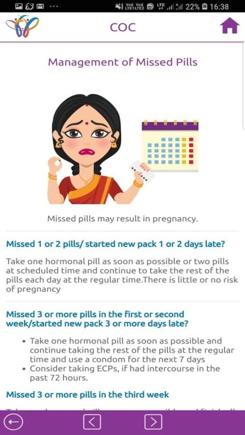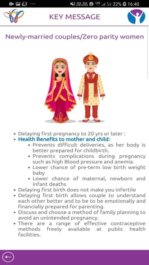 The family planning app is a ready reference on the different contraceptive methods for the service provider. The app will be useful for doctors, nurses and counsellors for providing family planning services. Both the spacing and limiting methods and their effectiveness, mechanism of action, benefits, limitations, side effects, how and when to use the method have been enumerated. The frequently asked questions, counseling and key messages offer notes on practice points. The quiz is an interesting area to test oneself. The queries will be answered by an expert for continued learning. The library section gives access to reference manuals and screening checklist tools. The Family Planning App is an ‘easy to use’ digital tool for capacity building.