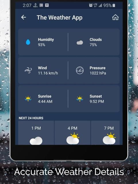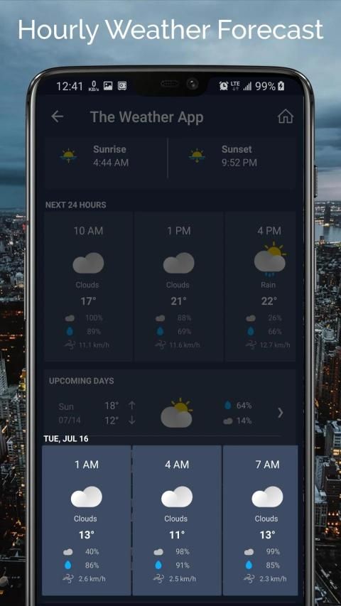 You need to allow the location permission after that The Weather App automatically detect your current location. There are many information in the app which includes weather, temperature, condition, wind speed, humidity, sunrise, sunset and also have hourly forecast.