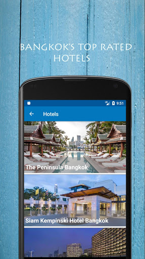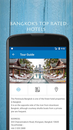 Tour Guide Thailand app also shows the top hotels, restaurants, shopping and sites in Bangkok with direct links to their websites, booking, and opens their exact location on Google Maps to get directions easily.