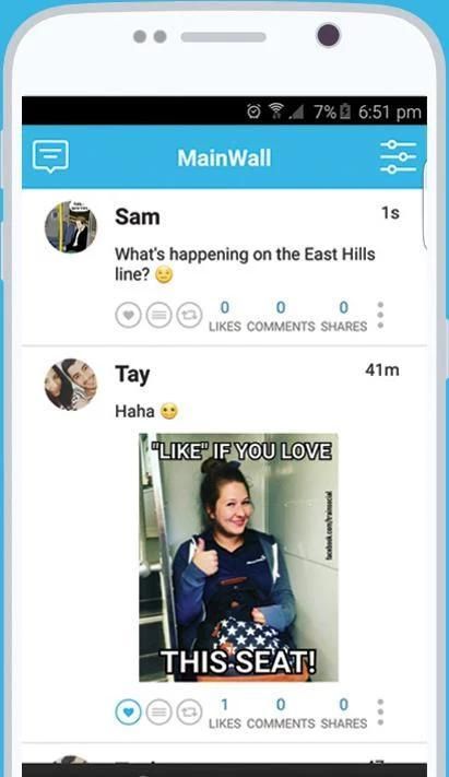 ऑस्ट्रेलिया के आसपास ही रेल लाइन पर यात्रा के दौरान यात्रियों के साथ तुरन्त चैट। ट्रेन, शेयर की तरह, पर अपनी स्थिति को अद्यतन और अन्य वास्तविक समय लोकल ट्रेन एप्लिकेशन की गतिविधियों पर टिप्पणी। ट्रेन सामाजिक उपयोगकर्ताओं को भी ऑनलाइन है, जो देखते हैं और अपने सभी दैनिक पहनना पर whilst मुक्त करने के लिए बातचीत, एक निजी बातचीत सत्र अनुरोध कर सकते हैं।