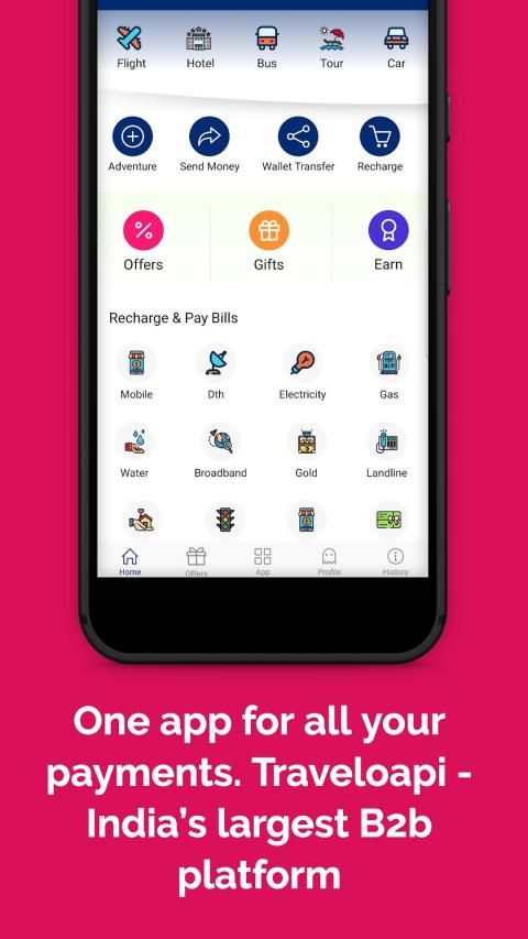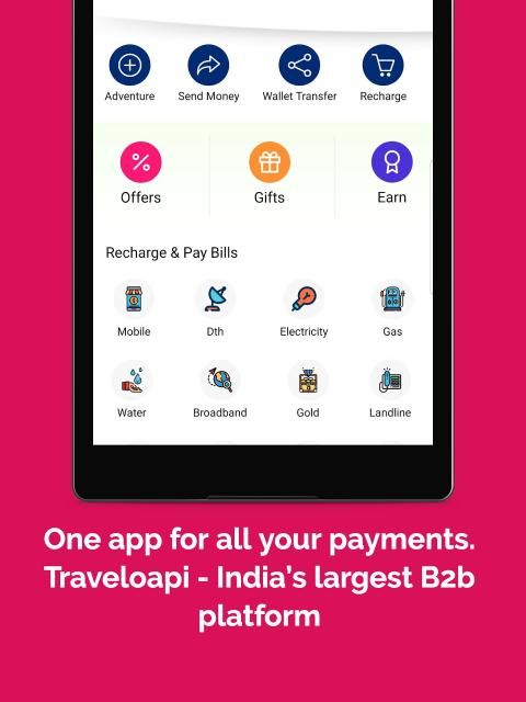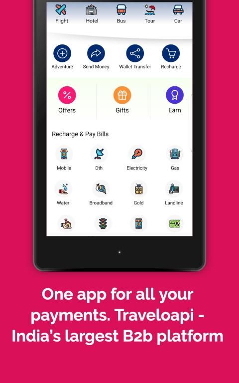 Traveloapi is India’s largest Earning B2b App. Use Traveloapi for mobile prepaid recharge, postpaid & utility bill payments, money transfer, online shopping, Insurance premium payment, electricity bill payment, DTH recharge, bus, car, hotel & flight booking, wallet to bank transfer, metro card recharge, buying gold & more.