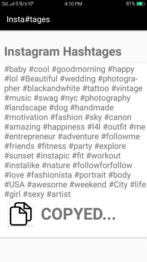 - >> बस एक हैशटैग नाम चुनें, "कॉपी" बटन पर टैप करें या "कॉपी विद फ़ेसबुक, इंस्टाग्राम, ट्विटर" बटन पर क्लिक करें (इसका मतलब है कि ऐप को कॉपी करें और खोलें) फिर इंस्टाग्राम, फेसबुक या ट्विटर खोलें और अपनी तस्वीरों और पोस्ट पर पेस्ट करें!