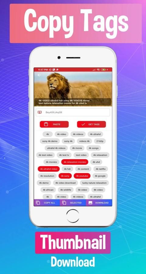 - Get Tags by Paste Youtube Video Link/ID or Select From Youtube apps another sources.