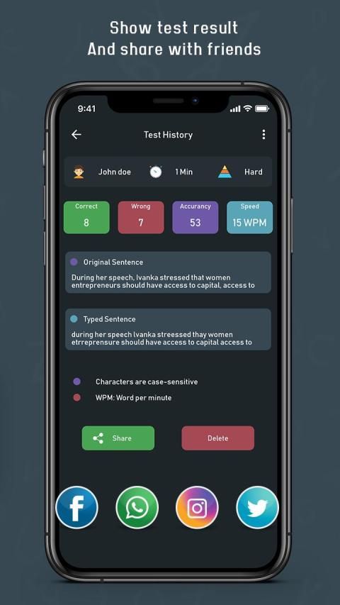 5. टेस्ट हिस्ट्री: टाइपिंग स्पीड टेस्ट ऐप के साथ टाइपिंग टेस्ट दें और भविष्य के रेफरल के लिए टेस्ट का परिणाम सेव करें। आप व्हाट्सएप, फेसबुक, इंस्टाग्राम या किसी भी सोशल मीडिया पर अपने दोस्तों और परिवार के सदस्यों के साथ परिणाम डाउनलोड और साझा कर सकते हैं।