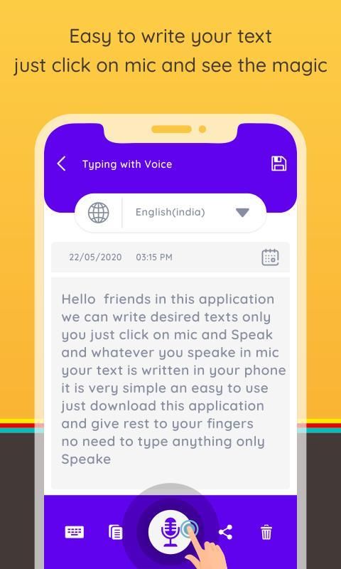 वॉइस टाइपिंग आपको आवाज के साथ टेक्स्ट लिखने / टाइप करने में सहायक के रूप में काम करता है। आप पाठ के लिए भाषण द्वारा कई भाषा में लिखने के लिए भी उपयोग कर सकते हैं।