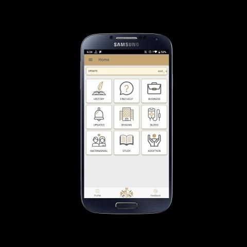 App includes features like, History, Business, Updates, Matrimonial, Adoption and Find Help.