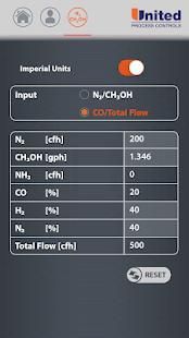 Allows calculation of flow rates and/or carbon monoxide percentage for a given total flow of carrier gas provided by a direct injection system for nitrogen-methanol mixtures. Includes a special feature that allows to observe the impact of ammonia addition on CO and H2 percentages.