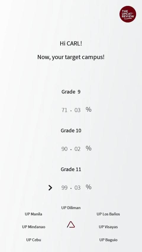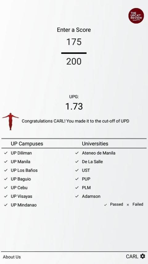 After answering a mock college entrance test, knowing your score is not enough. This application lets you know if you have what it takes to reach the required cut-off score of any of the seven constituent UP campuses and of any other universities like Ateneo, De La Salle, UST, PUP, PLM, etc.