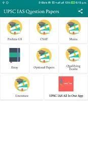 संघ लोक सेवा आयोग प्रश्न पत्रों पिछले वर्ष सवालों के 2011 से 2017 के लिए कागजात आवेदन पिछला साल, मेन (उत्तर कुंजी के साथ) प्रारंभिक के कागजात भी शामिल शामिल हैं - जनरल अध्ययन, CSAT (उत्तर कुंजी के साथ), वैकल्पिक विषयों, योग्यता या अनिवार्य विषयों, साहित्य, निबंध ।