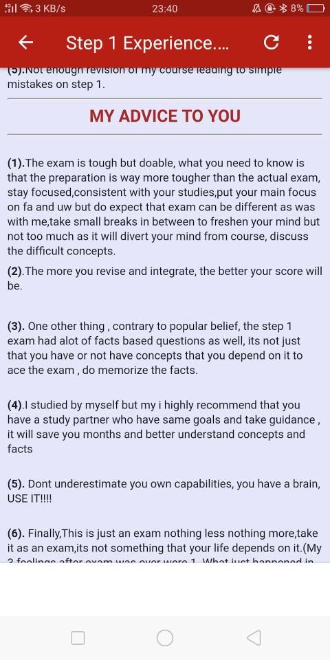 The aim of this app is to help people intending to take USMLE with adequate past experiences, advices and suggestions from the past takers. This has personally helped me in several aspects of my studies and am sure it will help you to.Going through this app time to time will prevent you from making some mistakes and bad decisions during your studies and or preparations for the USMLE exam. This app will help you LEARN FROM OTHER'S plans and MISTAKE their by helping you to PASS without failure.