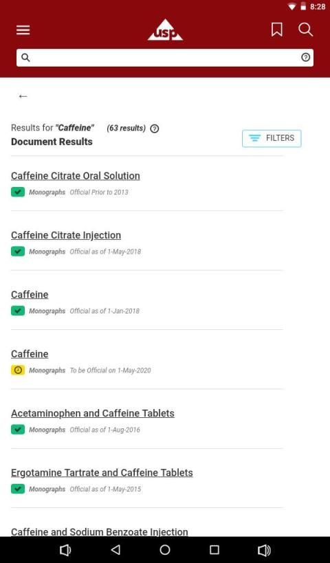 The “USP-NF Mobile” provides mobile access to a simplified version of the USP-NF Online. The application is available for Apple and Android devices. Each subscription allows you to install and activate the application on up to two devices. Please note that you will only have access to “currently official” and “not yet official” content. USP updates content monthly, and end-users will be prompted to download updates regularly. You must be connected to the internet to get these updates.