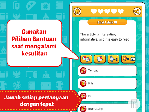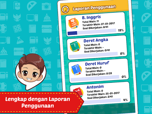 ============================================ ========= प्रश्नोत्तरी परीक्षण प्रश्न प्रस्तुत करने वाले प्रश्नोत्तरी आकर्षक रूप से पैक किए जाते हैं ताकि उपयोगकर्ता एक मजेदार तरीके से प्रश्नों पर काम करना सीख सकें। उन प्रश्नोत्तरी प्रश्नोत्तरी श्रृंखला जो उनके बीच जारी की गई है, एक प्रश्नोत्तरी प्रश्नोत्तरी, इस्लामी बुद्धिमान प्रश्नोत्तरी, बुद्धिमान इंडोनेशियाई प्रश्नोत्तरी और प्रश्नोत्तरी प्रश्नोत्तरी जूनियर हाई स्कूल है