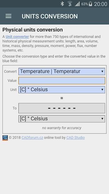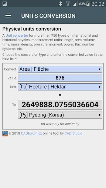 सैकड़ों अंतरराष्ट्रीय और ऐतिहासिक भौतिक माप इकाइयों को परिवर्तित करता है, न केवल सीएडी क्षेत्र - लंबाई, क्षेत्र, मात्रा, समय, द्रव्यमान, घनत्व, गति, दबाव, बल, पल, शक्ति, ऊर्जा, प्रवाह, संख्या प्रणाली, कोण, आवृत्ति, त्वरण, तापमान, चमकदार तीव्रता, विद्युत चार्ज, संख्यात्मक प्रणाली, आदि