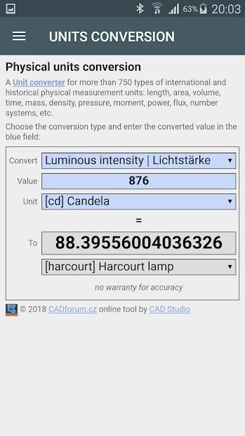 Converts hundreds of international and historical physical measurement units, not only from the CAD area - length, area, volume, time, mass, density, speed, pressure, force, moment, power, energy, flux, number systems, angle, frequency, acceleration, temperature, luminous intensity, electric charge, numeric system, etc.