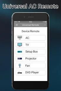 मल्टी डिवाइस सार्वभौमिक एसी के लिए रिमोट कंट्रोल के साथ एयर कंडीशनिंग के कई मॉडल को नियंत्रित करता है, 1000 से अधिक विभिन्न उपकरणों का समर्थन करता है, यह बहुत उपयोगी है जब आप अपने रिमोट कंट्रोल हड्डी टूट गई है। सैमसंग उपकरणों, एसी जॉनसन, एसी एलजी फिलिप्स या हवा सबसे शामिल किए गए हैं।