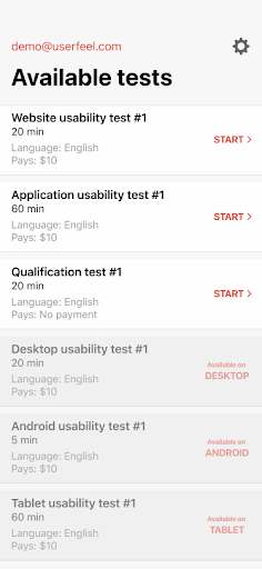 Userfeel.com डेस्कटॉप, मोबाइल और टैबलेट पर दूरस्थ उपयोगिता परीक्षण प्रदान करता है।उपयोगिता परीक्षण रिकॉर्ड करने के लिए इस ऐप का उपयोग परीक्षकों द्वारा किया जाता है।